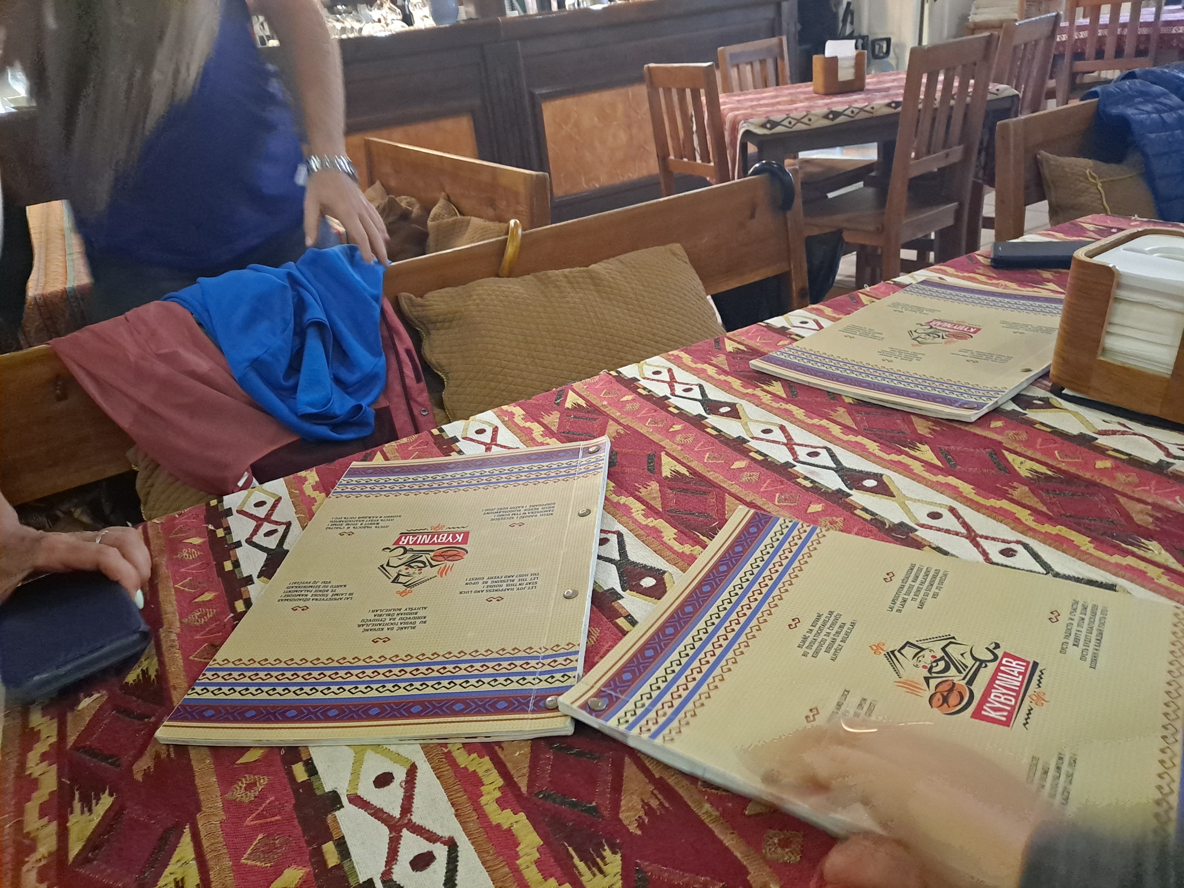 Po kilku, może kilkunastu minutach oczekiwania dostaliśmy nasze dania. Jola i Agnieszka wzięły po dużym pierogu -- Jola z nadzieniem rybnym, Agnieszka z kurczaka. Jarek i ja wzięliśmy kibiny. Jeden z moich był z wołowiną, a drugi z baraniną. Do tego wziąłem wielki talerz z sałatką z surowych warzyw. Zaspokoiwszy głód i pragnienie zakosztowania lokalnych specjałów, Agnieszka i ja wzięliśmy jeszcze po kawie. Spytałem, czy parzą tutaj ten napój w jakiś typowo karaimski sposób, ale odpowiedź kelnerki była przecząca. Korzystają z typowego kawiarnianego ekspresu. Agnieszka zażyczyła sobie kawę czarną, a ja cappucino. Kiedy kelnerka postawiła je przed nami zgodnie z naszym zamówieniem, Jola zadała bardzo dziwne pytanie.