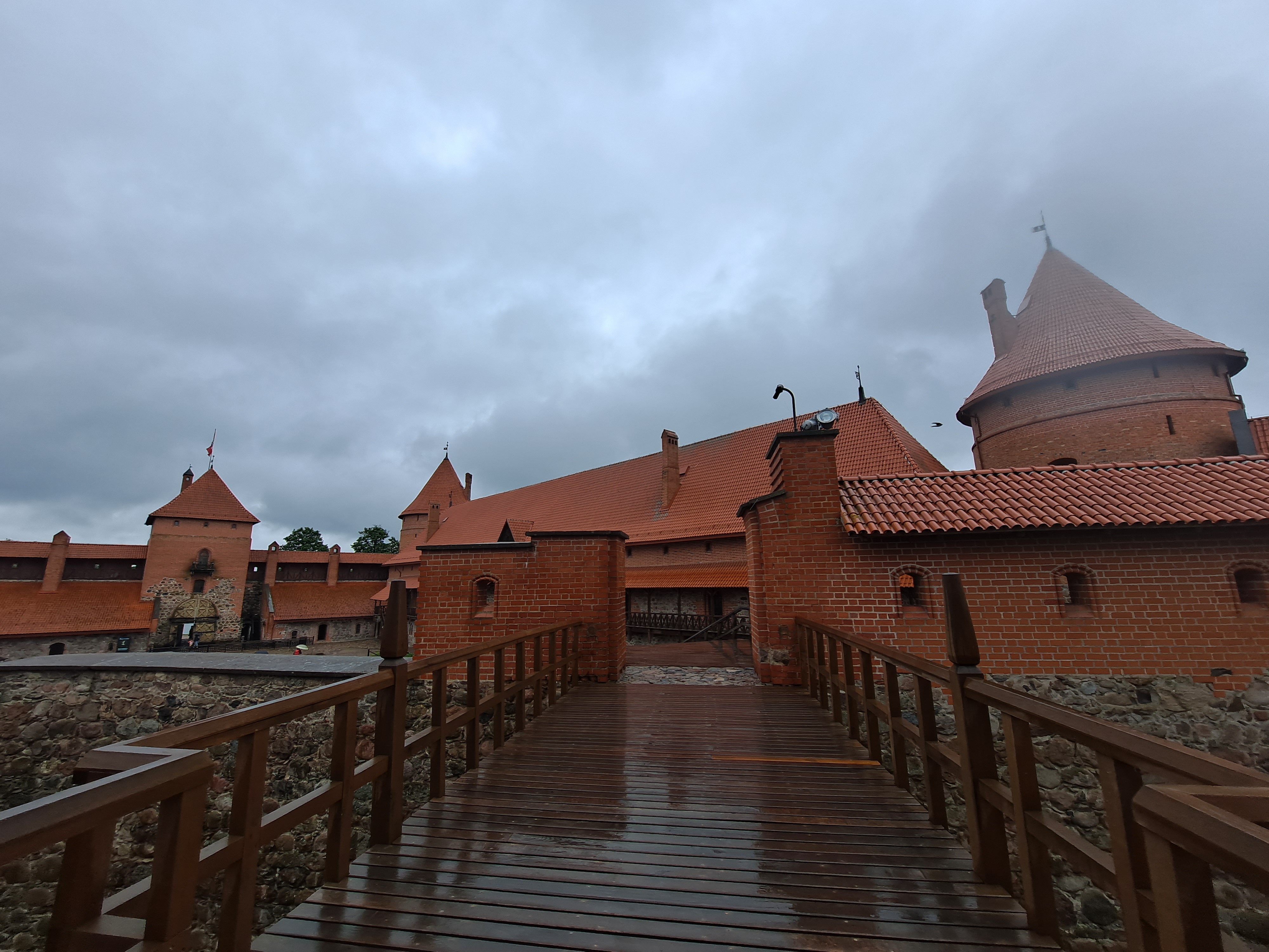 Deszcz nie przestał padać ani na sekundę, ale bywały momenty, że nie był aż tak rzęsisty. Po wyjściu z "Kibinu Salis" poszliśmy alejką nad samym jeziorem, gdzie natknęliśmy się na namioty z pamiątkami, gdzie spędziliśmy jakieś dziesięć minut, po czym zignorowawszy propozycję "naganiacza", czyli młodego chłopaka, który chciał nas namówić na przewóz zadaszoną łodzią, przeszliśmy mostem prosto do bramy zamkowej. Pamiętałem, że w tym miejscu, tuż przy bramie w 2002 roku można było za drobną opłatą postrzelać z łuku, z czego wówczas skorzystałem, ale teraz teren wokół zamkowych murów był puściuteńki.