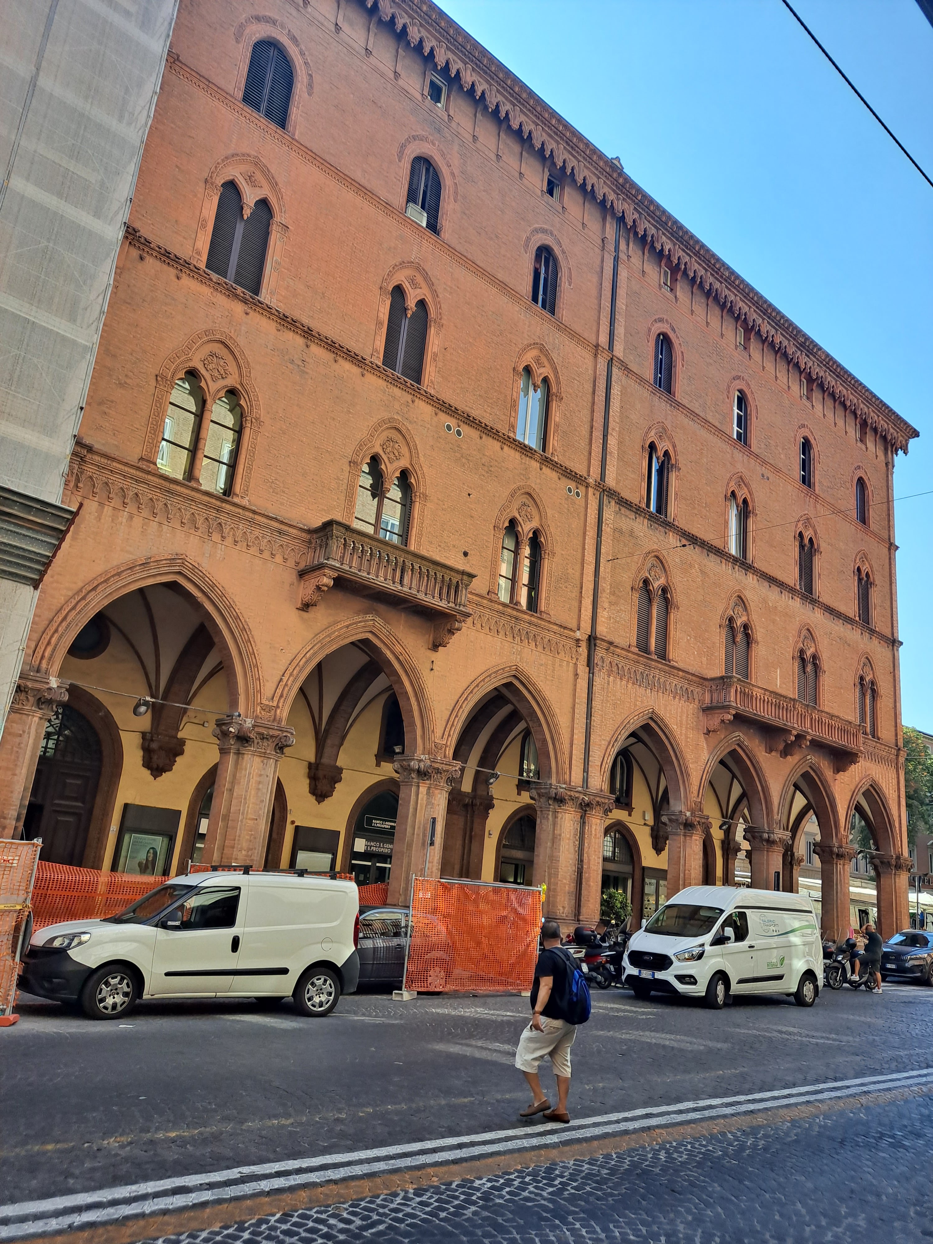 Wyszedłszy przed budynek Dworca Centralnego udaliśmy się od razu przez Piazza delle Medaglie d'Oro na drugą stronę Strada Statale Porrettana, gdzie znaleźliśmy się w pierwszych podcieniach tak typowych dla bolońskich ulic. Od razu też minęliśmy leżącego na śpiworze rozłożonym na chodniku bezdomnego, co chyba jest widokiem wskazującym na to, że znajdujemy się w dużym mieście europejskim. Minąwszy kilka sklepów i lokali gastronomicznych skręciliśmy w jedną z bram, żeby przejść przez podwórko zajęte przez stoliki restauracyjne po naszej prawej. Po lewej w owym podwórku ciągnęły się sklepy. W ten sposób poszliśmy niejako skrótem ścinając róg kamienicy, ponieważ wyszliśmy inną bramą od strony Piazza XX Settembre. Nazwa placu upamiętnia 20 września 1870, kiedy to ogłoszono likwidację państwa papieskiego i wcielenie jego ziem do zjednoczonych Włoch.