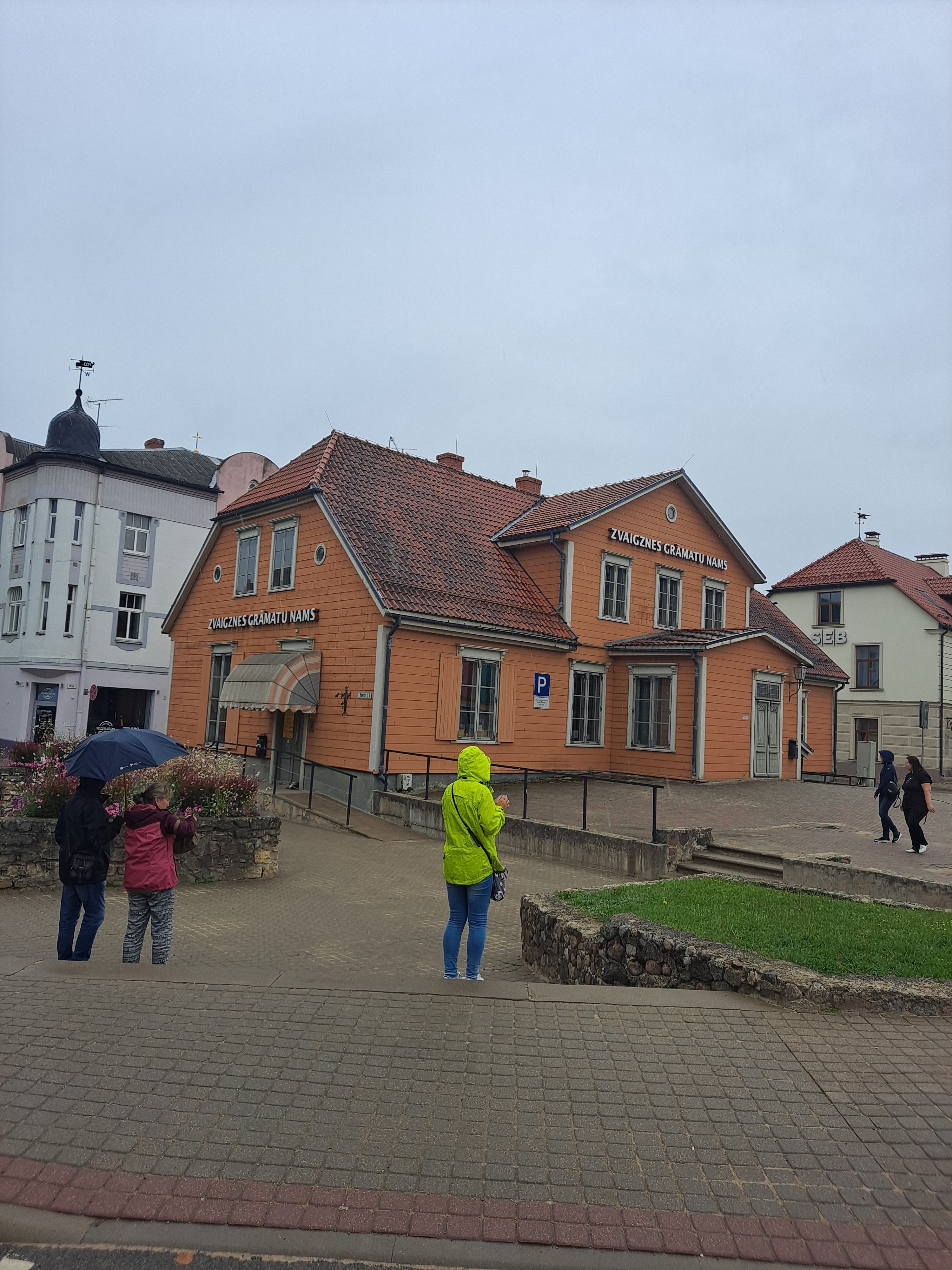 Po zaparkowaniu samochodu na Smilšu laukums (Placu Piaskowym), udaliśmy się dziarskim krokiem w kierunku Hotelu Cēsis, gdzie już poprzedniego dnia dzięki mapom Google wyszukałem restaurację z bardzo rozsądnymi cenami. Kiedy wreszcie tam dotarliśmy, doznałem pewnej konfuzji, bo w tym miejscu były chyba dwa lokale -- Kafejnica PAGRABIŅŠ i Kafejnica Vasaras Terase. Sama hotelowa restauracja miała wejście pewnie gdzie indziej, ale tego już nie sprawdziliśmy. Akurat rozpadał się deszcz, więc goście siedzący przy stolikach na tarasie zaczęli szukać schronienia, a my czym prędzej zrezygnowaliśmy z pomysłu zajęcia jednego z nich. Znaleźliśmy jednak wejście do innej kawiarni (tak mi się przynajmniej zdaje), w podpiwniczeniu hotelowego budynku, tyle, że tam była samoobsługa, a do kontuaru stała ogromna kolejka ciągnąca się przez dwa pomieszczenia lokalu. Po pięciu minutach stania, widząc, że postęp jest znikomy, postanowiliśmy poszukać innego miejsca.